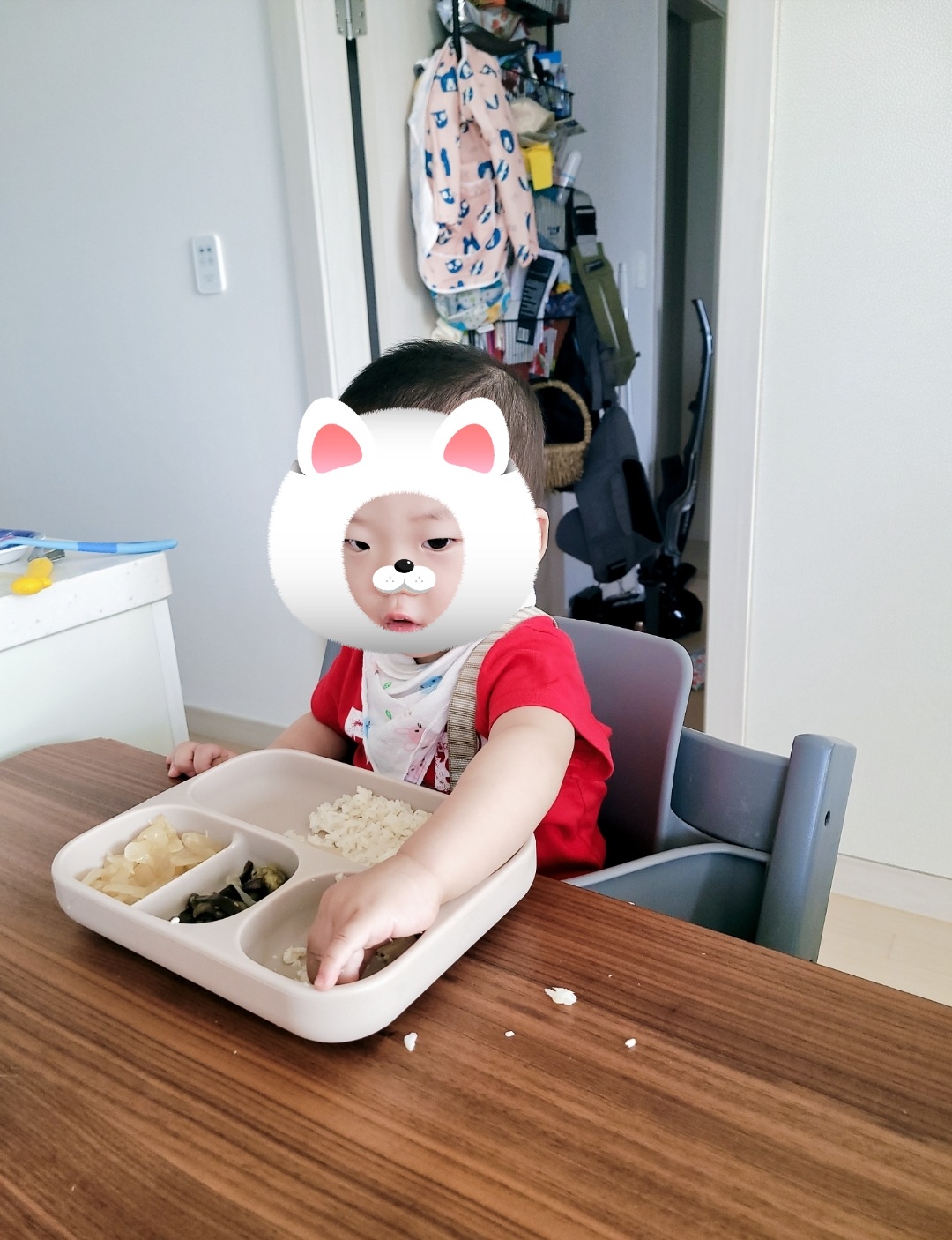 애기가 아직 자기 팔이 자기팔인지도 잘 모르고 알아도 식판을 엎기 일쑤입니다.