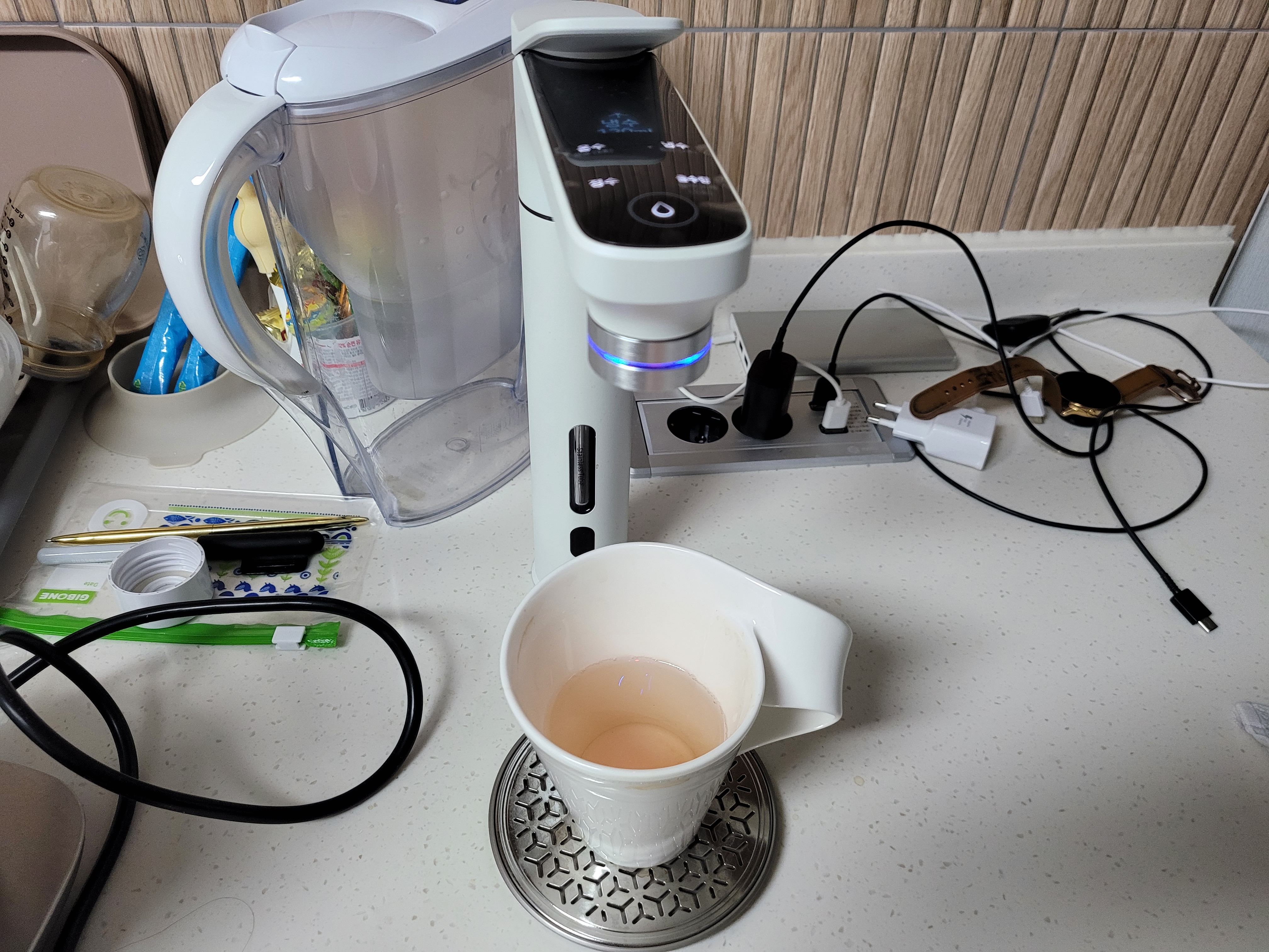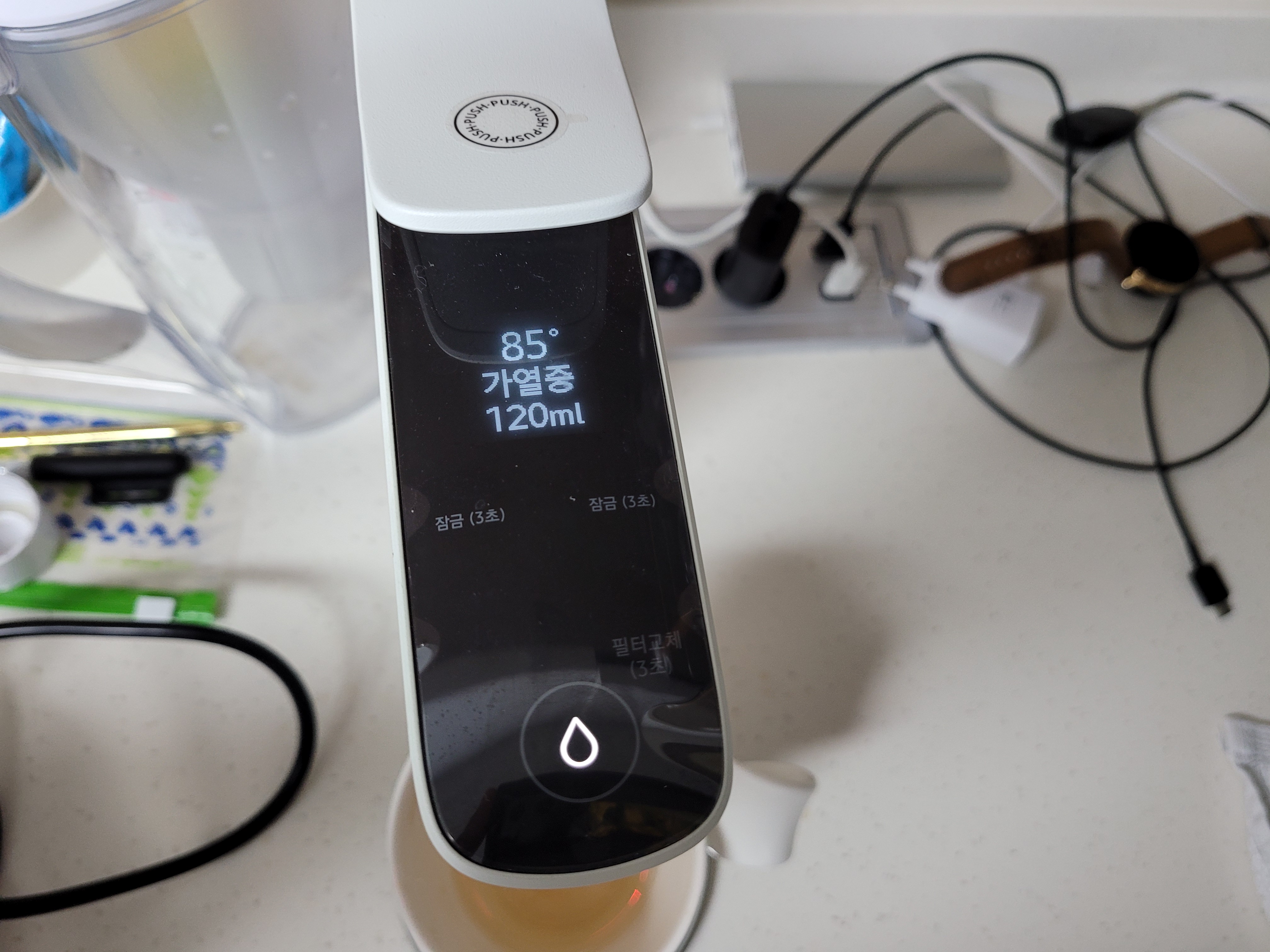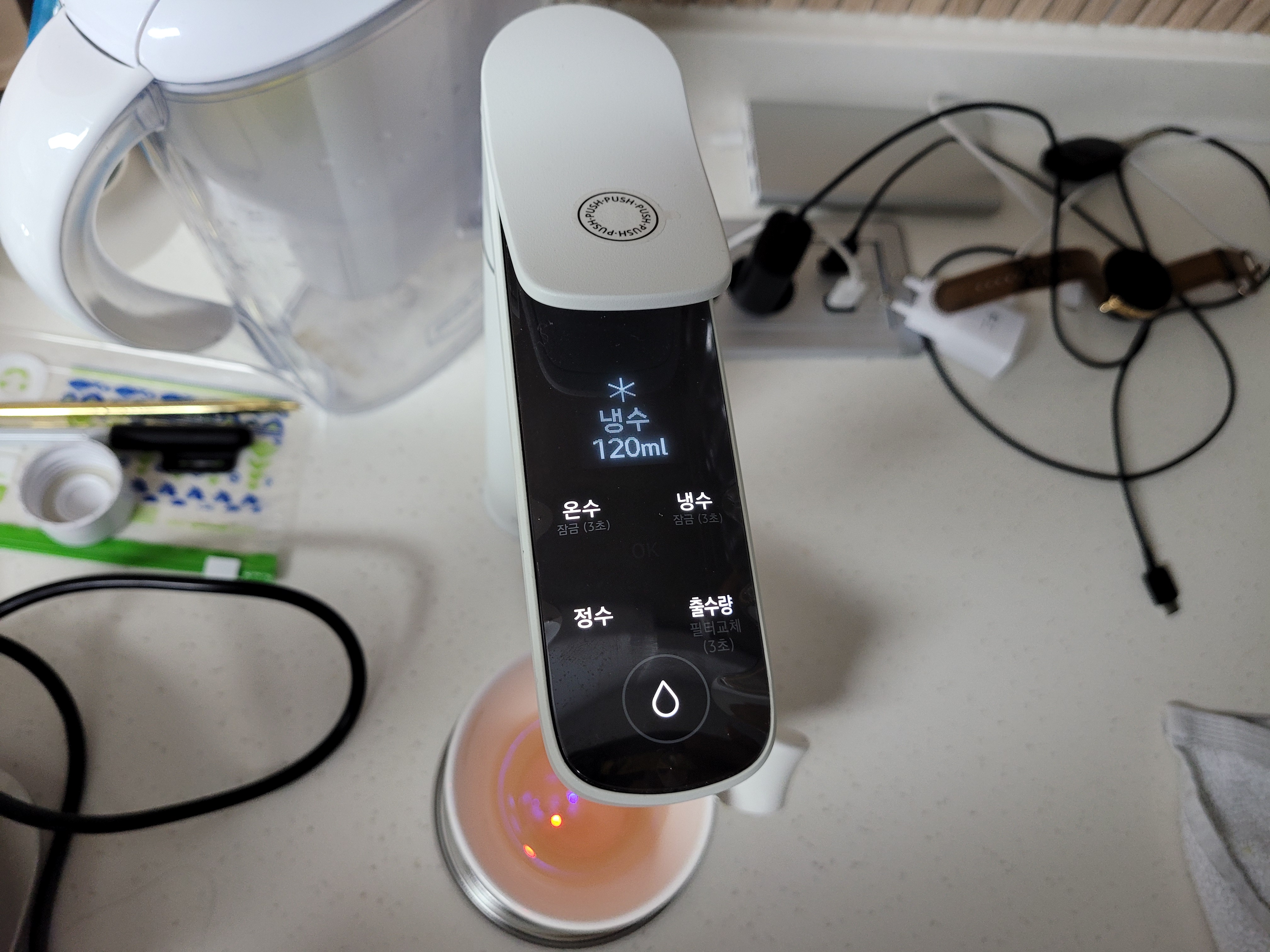 이번에 새로 이사간 집에서는 부엌의 공간 여유가 있어서 이번엔 정수기를 사자 하는 마음으로 고민하다가 정수기 노즐과 정수기 본체가 나눠져있는 삼성 비스포크 정수기를 선택하였습니다. 아이에게 요새 보리차를 끓여주고 있으니 온수도 되는 제품으로 구매하자 하여 냉온정 정수기로 구매하였는데... 실수였습니다. 삼성 제품을 1세대로 사다니...요새 방심했습니다. 이런...온수 제품은 온수를 써야하기 때문에 따로 단독선이 필요하다고 하여 인테리어 사장님께 요청드려서 단독선으로 따서 미리 만들어 뒀습니다. 그리고 와서 설치를 하였습니다. 저는 회사에 있었어서 아내님께서 다되었다고 하고 집에 가서 보았습니다. 제일 중요한 온수! 실행을 해봅니다.